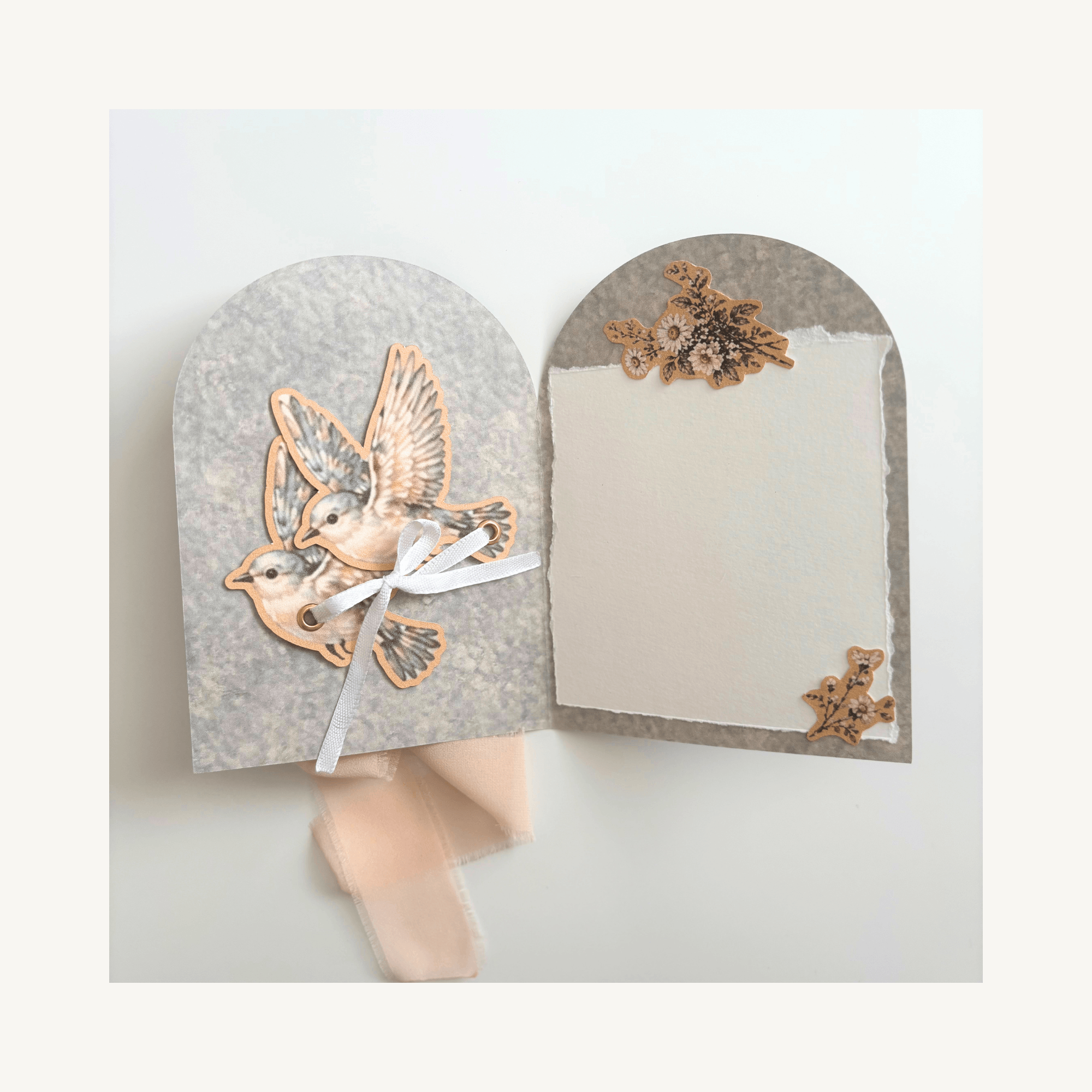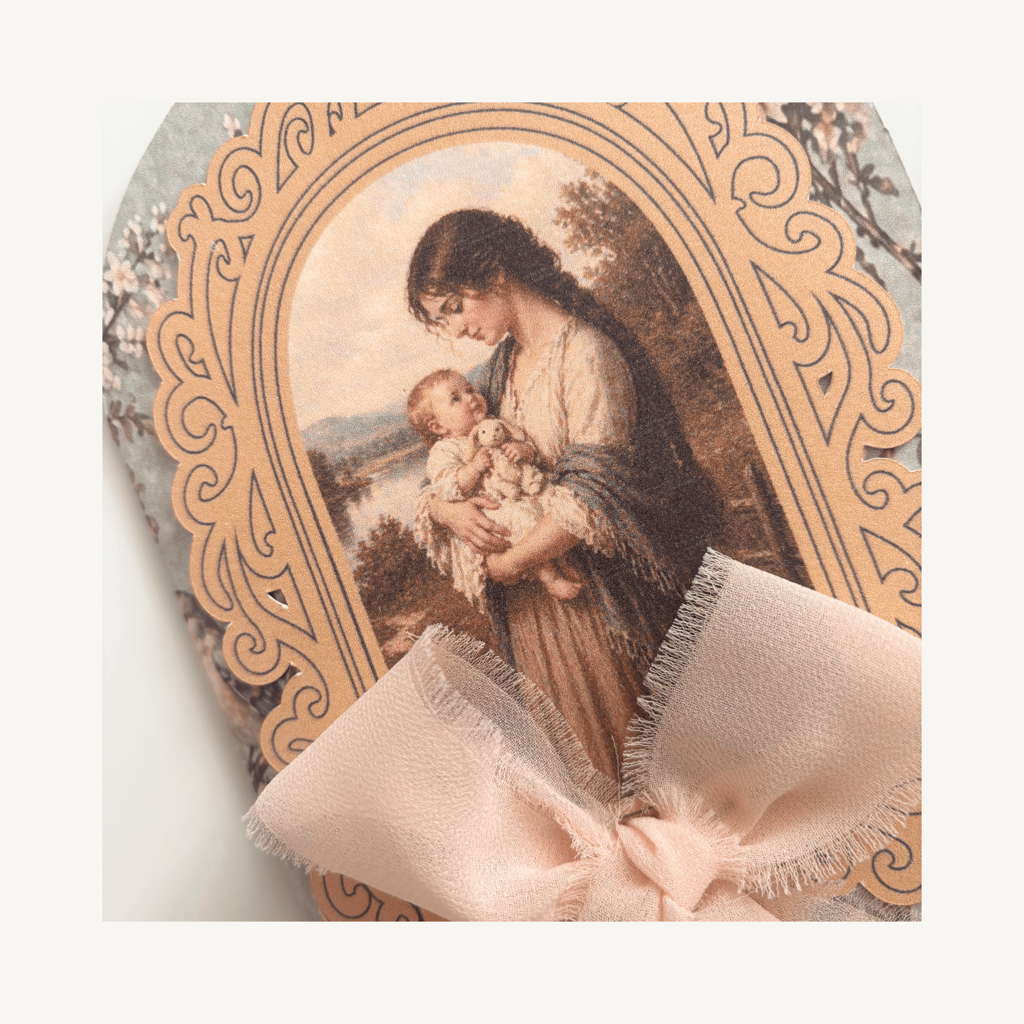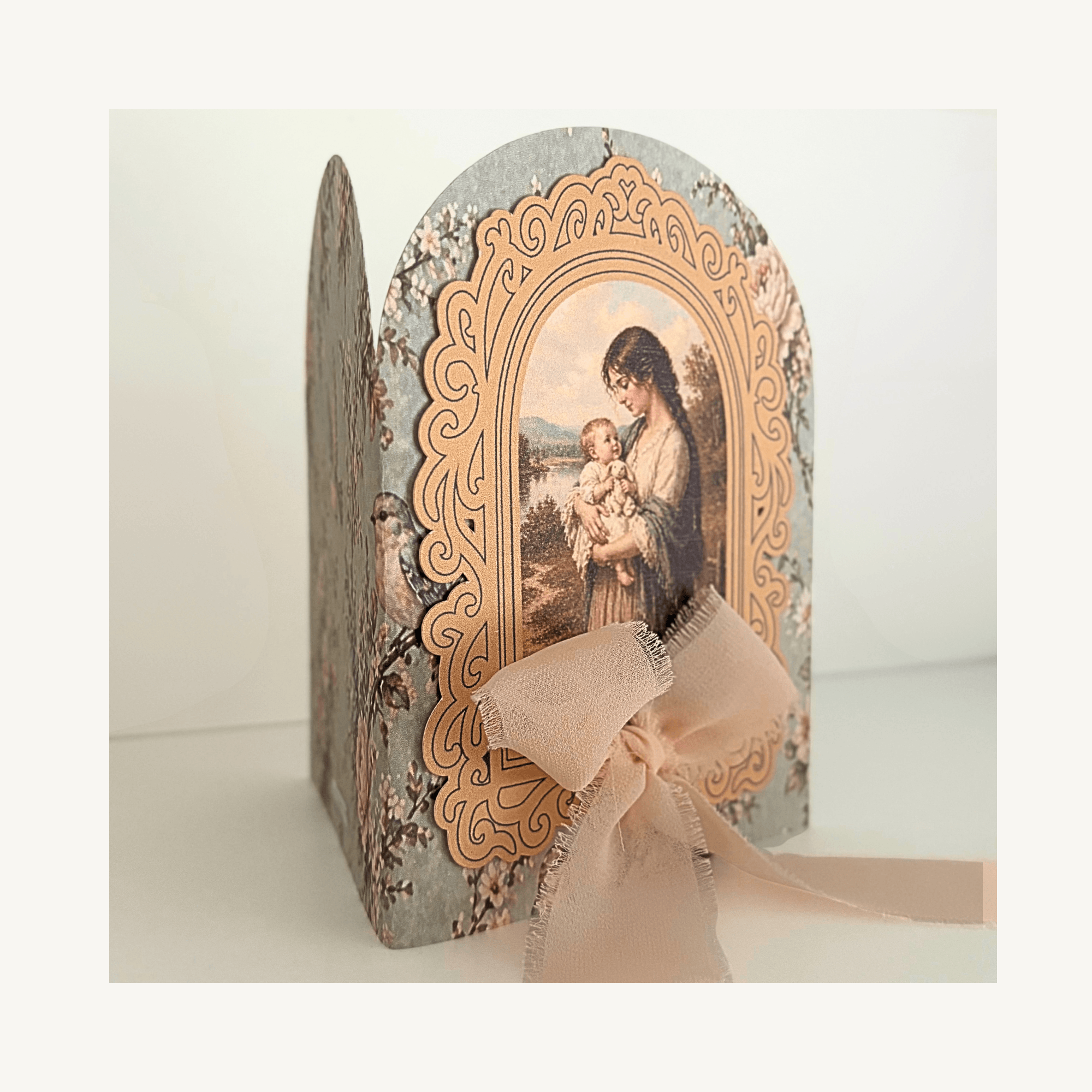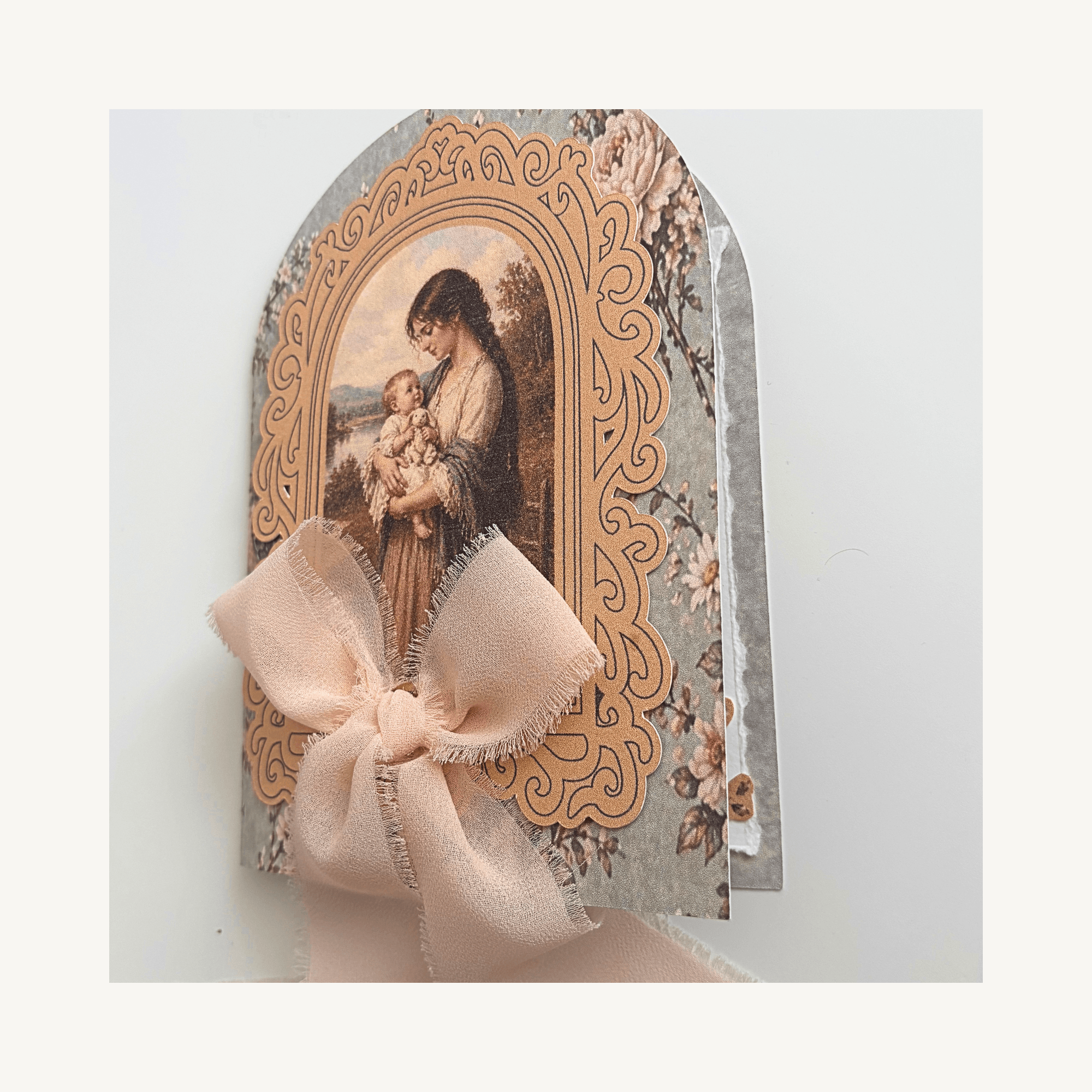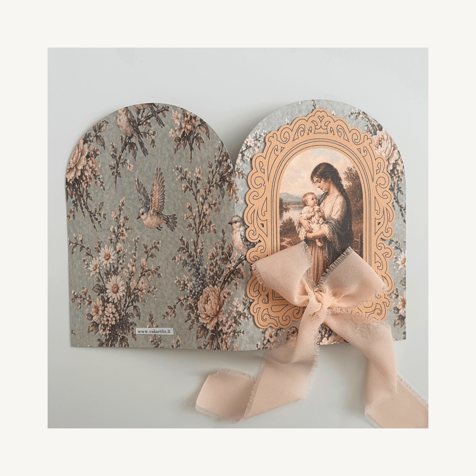 Rankų darbo atvirukas su vintažinio stiliaus gėlėmis, paukšteliais ir motinos su kūdikėliu paveiksliuku. Atvirukas spinduliuoja ramybe, gerumu ir begaline meile. Dovanokite kūdikio sutiktuvėms, mamos dienos proga arba norėdami nustebinti mylimą moterį. Viduje yra papildomas kaspinėlis – vieta, kurioje galima įdėti pinigų, dovanų kuponą ar laiškelį.
