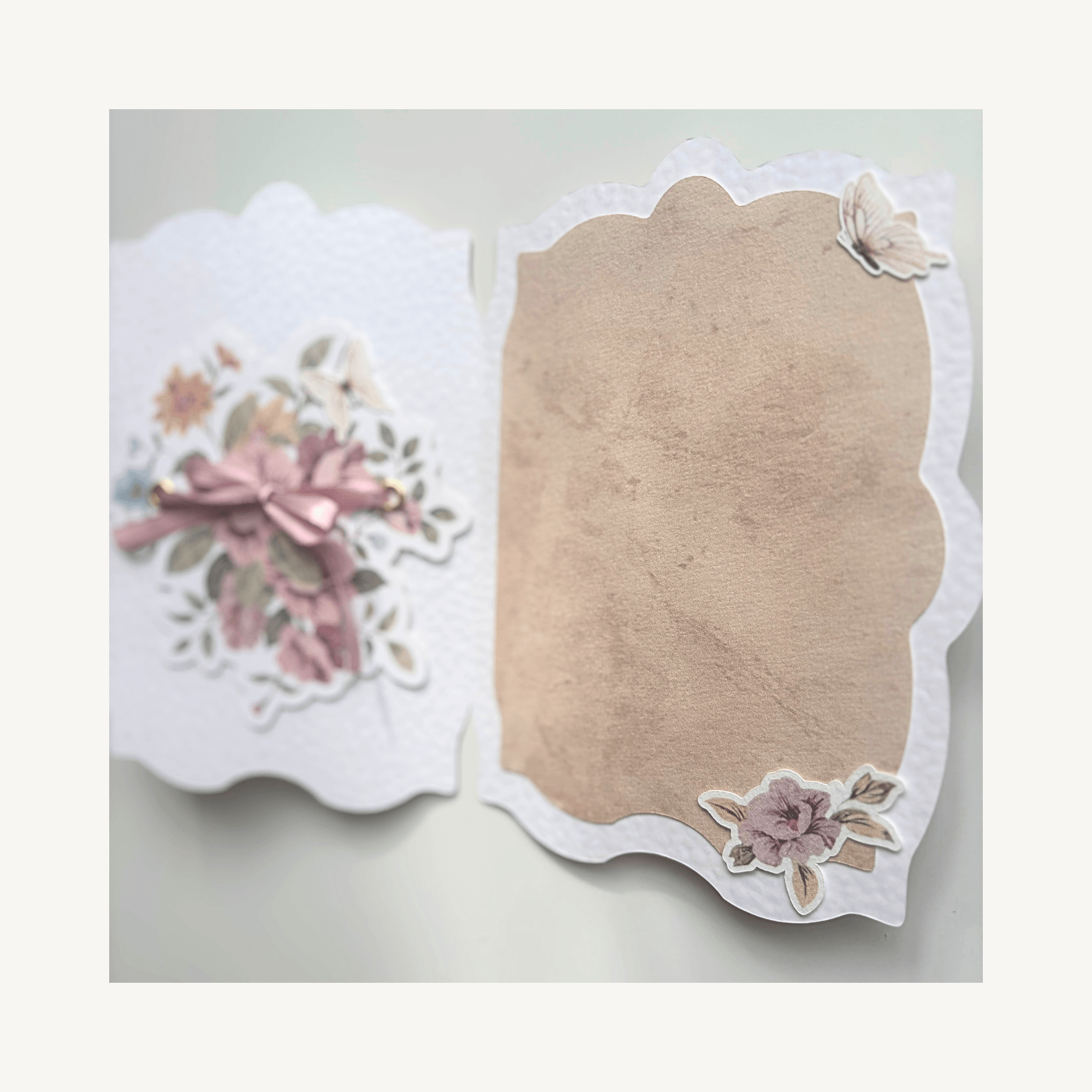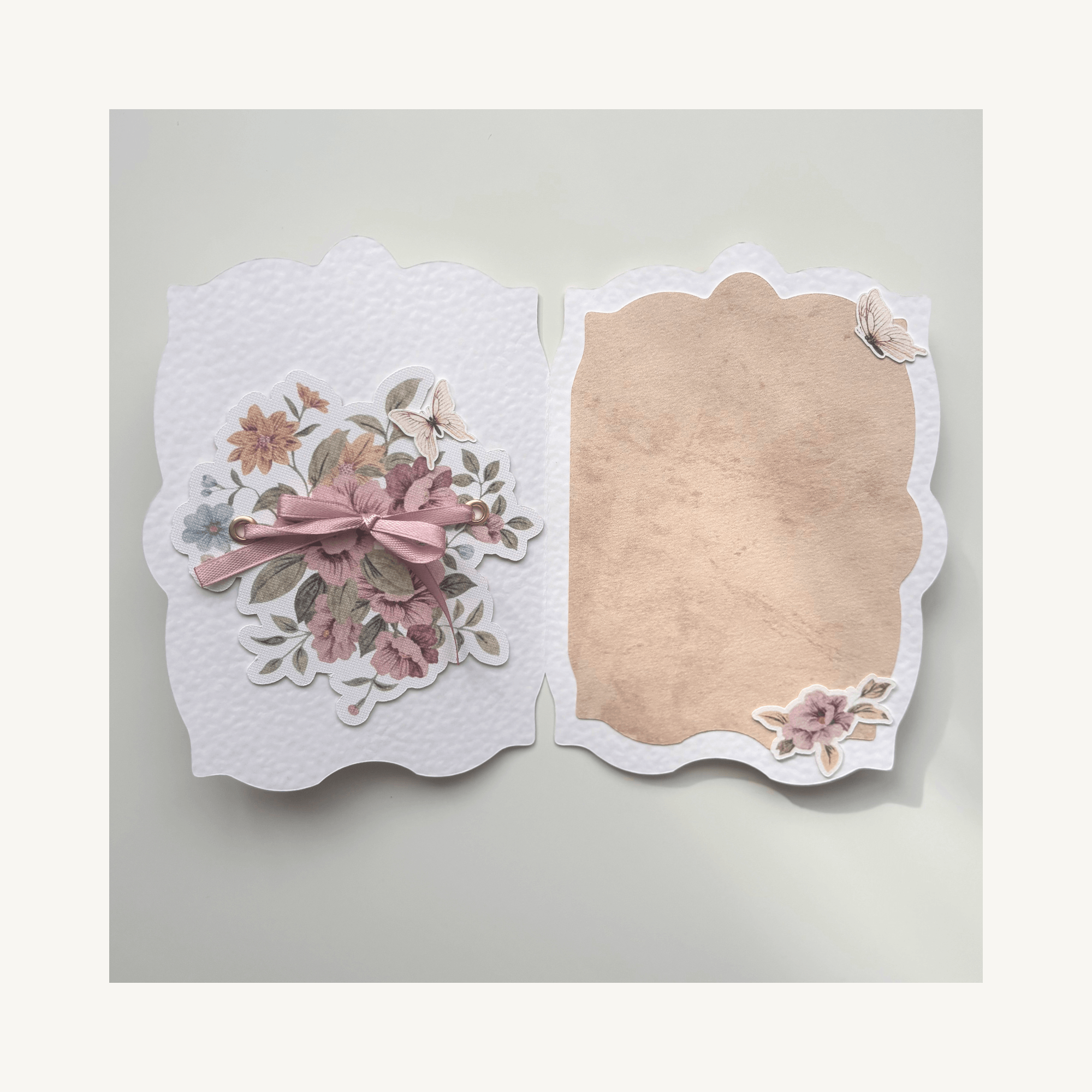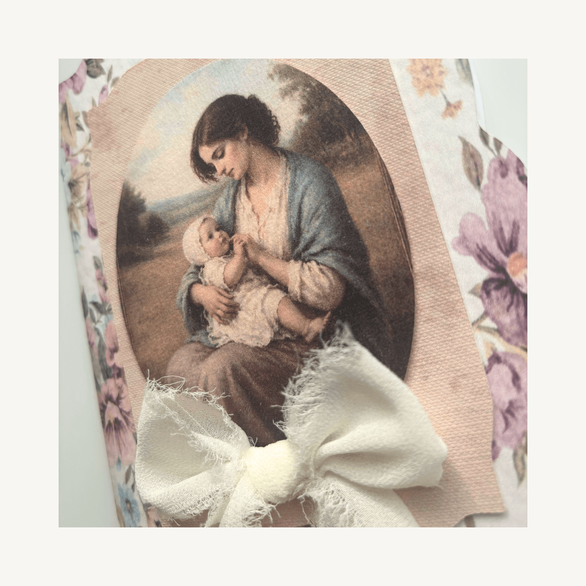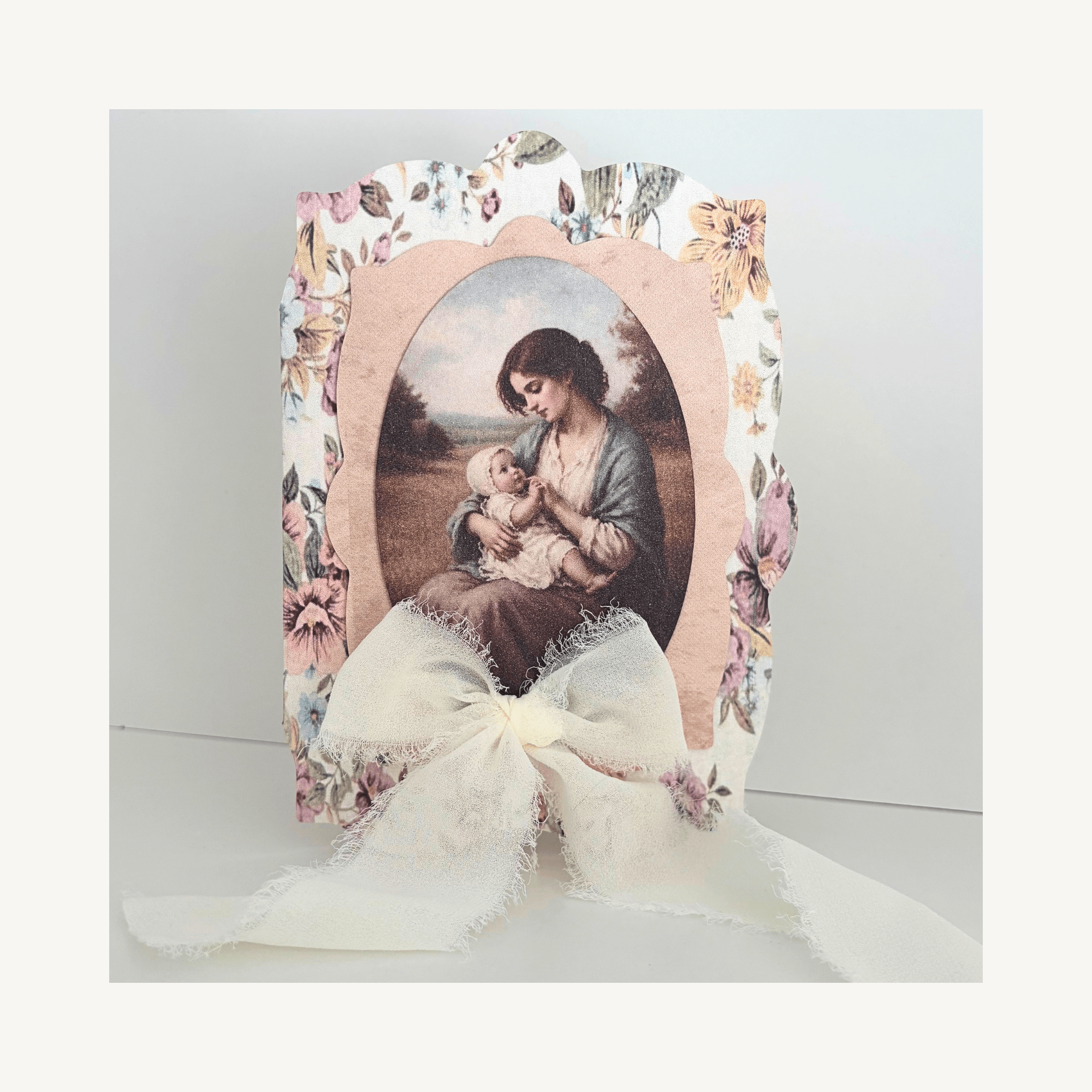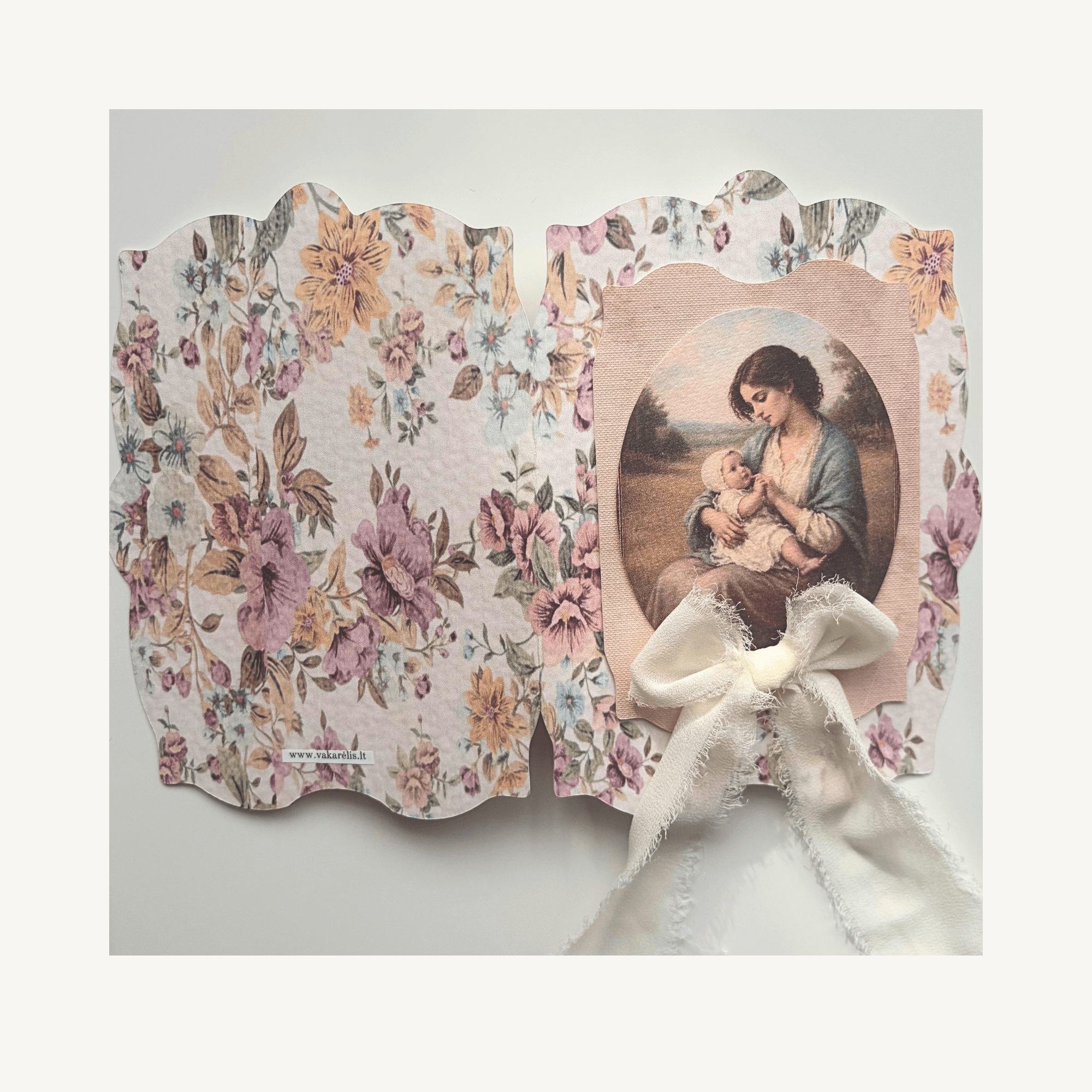 Rankų darbo atvirutė su vintažinio stiliaus gėlėmis ir motinos su kūdikėliu paveiksliuku. Atvirukas spinduliuoja ramybe, gerumu ir begaline meile. Dovanokite kūdikio sutiktuvėms, mamos dienos proga arba norėdami nustebinti mylimą moterį. Viduje yra papildomas kaspinėlis – vieta, kurioje galima įdėti pinigų, dovanų kuponą ar laiškelį.