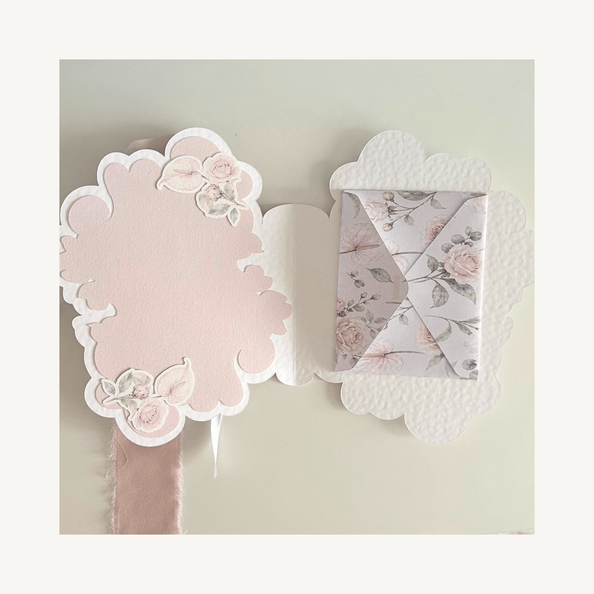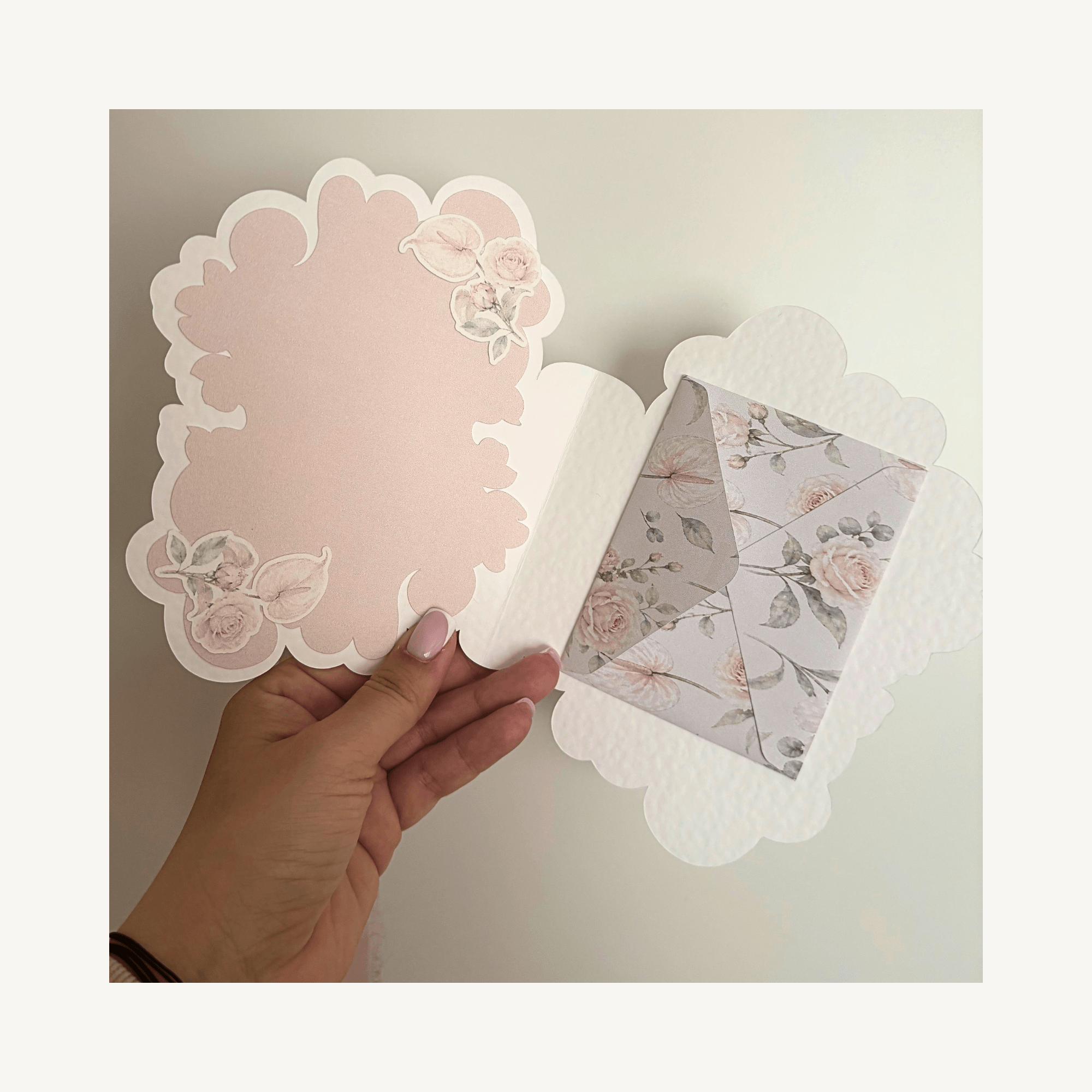 Švelnios spalvos, gėlių motyvai ir lengva elegancija kuria jaukų, širdžiai artimą jausmą. Viduje rasite nedidelį vokelį, kuriame galėsite įdėti pinigus ar mažą laiškutį.