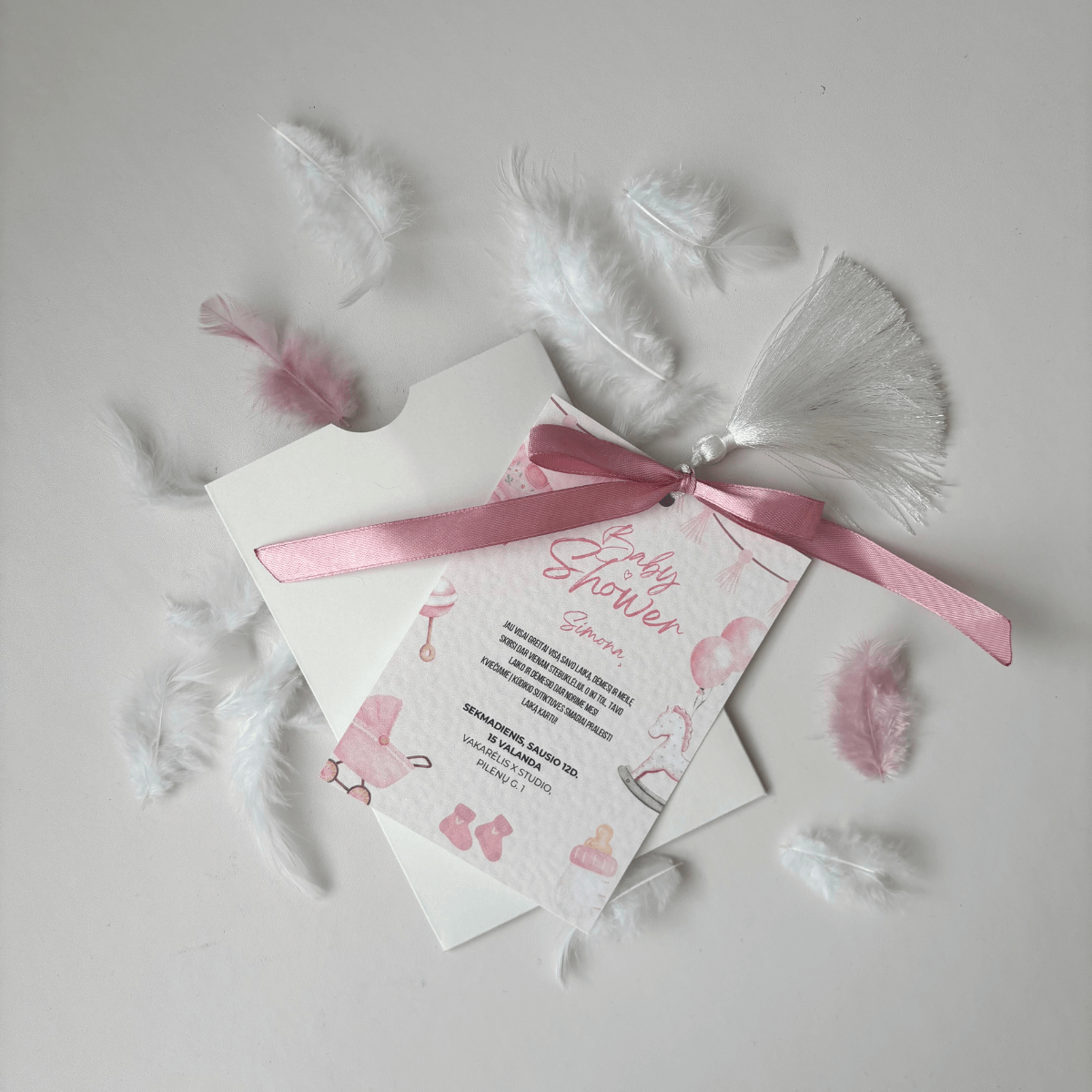 Rinkinuke rasite vokelį pripildytą dekoratyvinėmis plunksnelėmis bei pakvietimą su kaspinėliu ir kutu.
